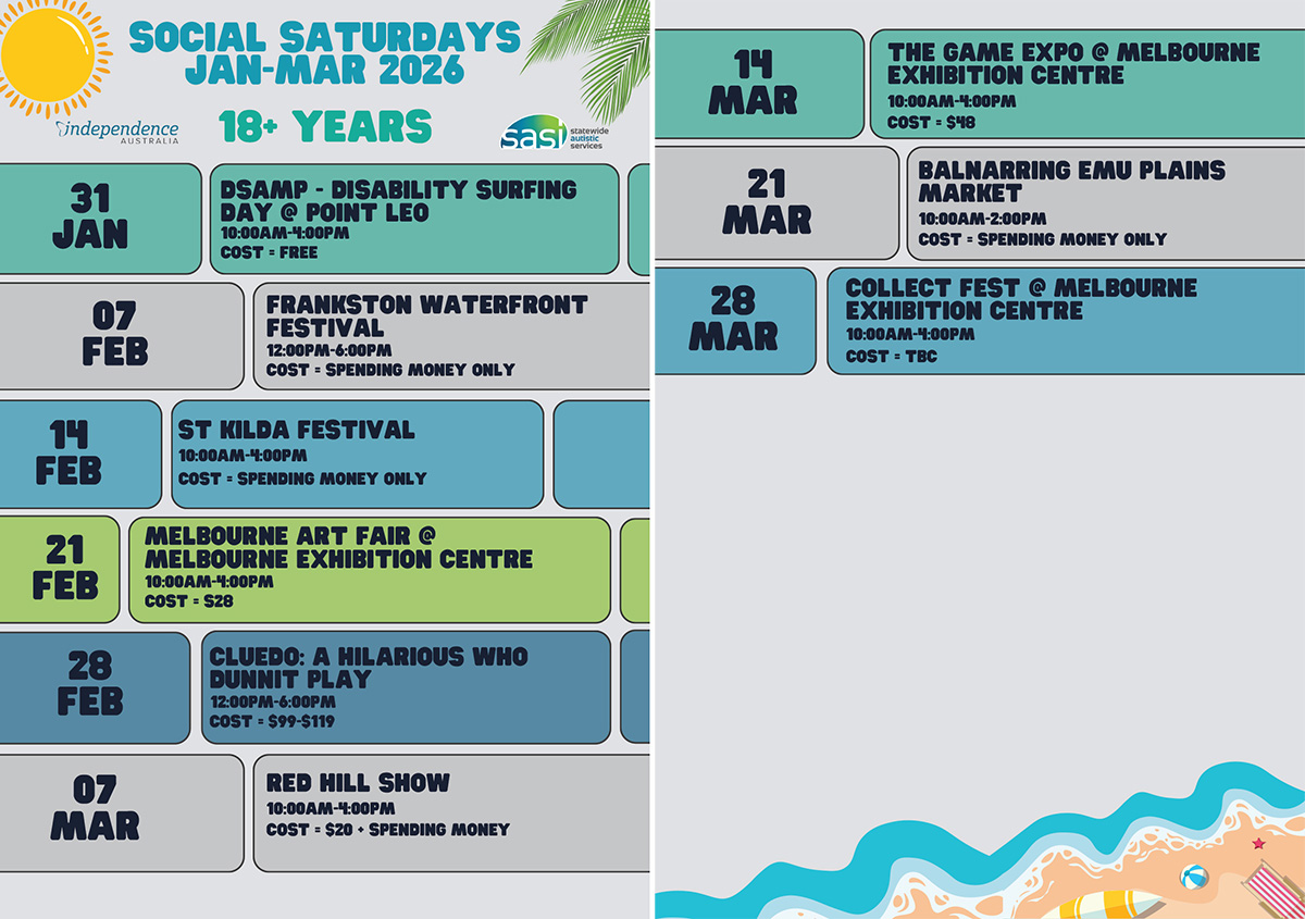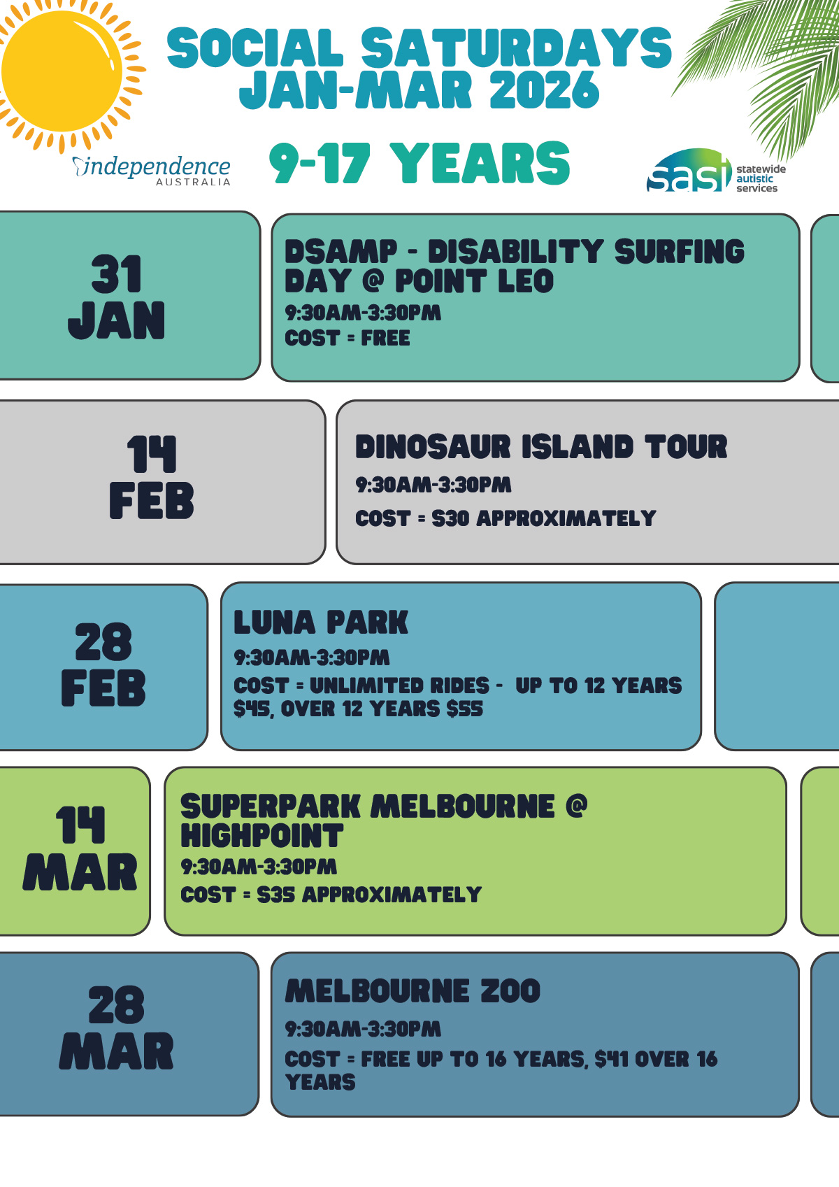 At SASI you will be supported to participate in a range of different activities across Melbourne, some of the fun and exciting places we have visited and activities we have held so far include but are not limited to: